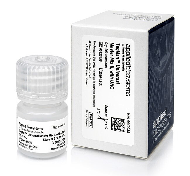 Supplied at 2X concentration. The mix contains AmpliTaq Gold™ DNA Polymerase, Uracil-DNA Glycosylase, dNTPs with dUTP, Passive Reference 1 and optimized buffer components. This pack contains one 5 mL tube, sufficient for 200 reactions at the 50 μL total volume. Store at 2°C to 8°C in the dark.